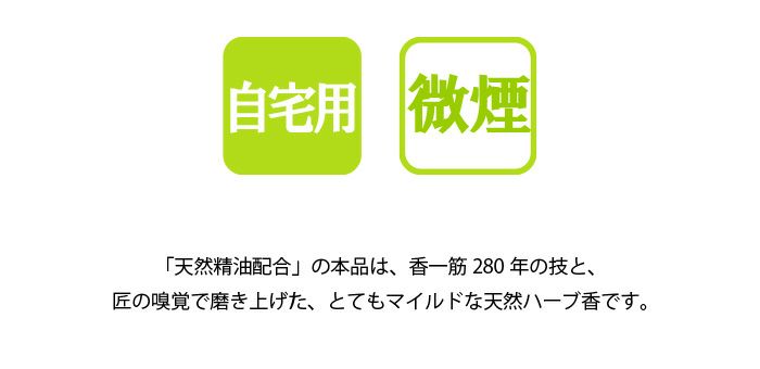 「天然精油配合」の本品は、香一筋280年の技と、匠の嗅覚で磨き上げた、とてもマイルドな天然ハーブ香です。