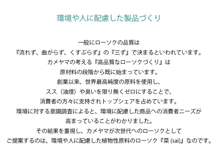 一般にローソクの品質は『流れず、曲がらず、くすぶらず』の『三ず』で決まるといわれています。カメヤマの考える『高品質なローソクづくり』は原材料の段階から既に始まっています。創業以来、世界最高純度の原料を使用し、スス(油煙)や臭いを限り無くゼロにすることで、消費者の方々に支持されトップシェアを占めています。 環境に対する意識調査によると、環境に配慮した商品への消費者ニーズが高まっていることがわかりました。その結果を重視し、カメヤマが次世代へのローソクとしてご提案するのは、環境や人に配慮した植物性原料のローソク『菜(sai)』なのです。
