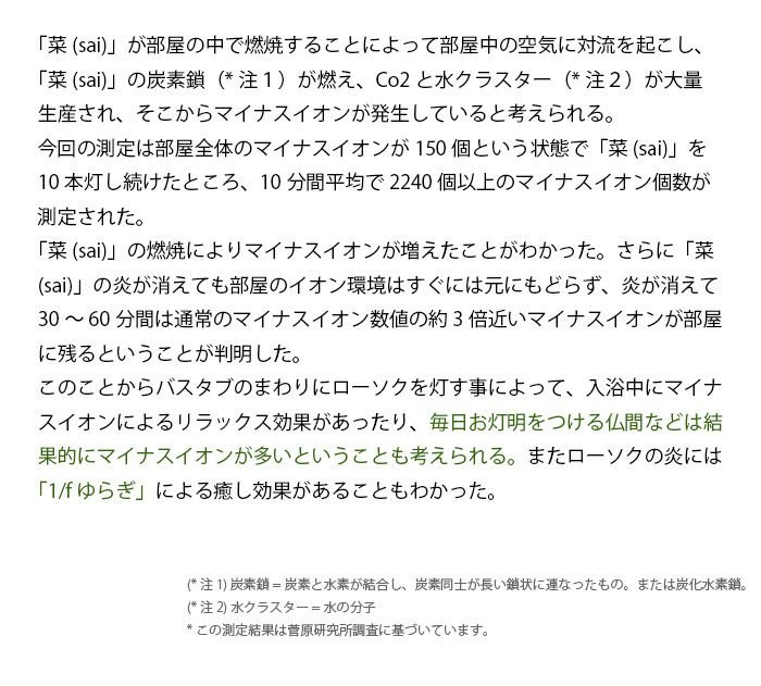 植物を栽培し、抽出した原料を使用しているため繰り返し生産できますので、自然環境への影響がほとんどありません。スス(油煙)がほとんど出ず、消した後の臭いが気にならず、お仏壇やお部屋を汚すことなく安心してお使い頂けます。また、ローソクが燃焼する際に放出されるマイナスイオンには、心身がリラックスし、お部屋の空気をさわやかにリフレッシュさせる効果があるといわれています。生産から消費まで自然環境に配慮した人にやさしいローソク『菜(sai)』の誕生です。