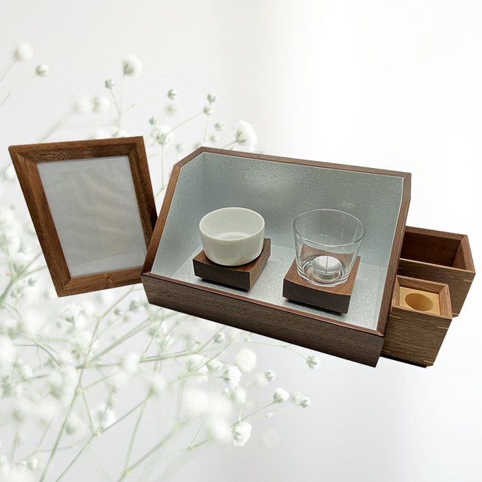ローソクと線香を安全に使うことができる「安心空間」と、写真立てなどの道具をセットにしました。