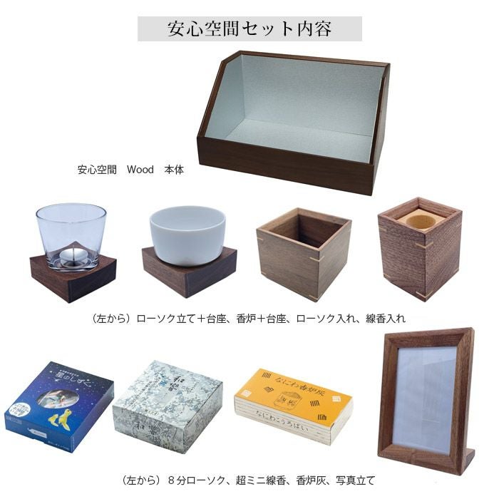 「安心空間」本体に加え、写真立て、ローソク、線香、そして香炉灰まで全て揃っています。