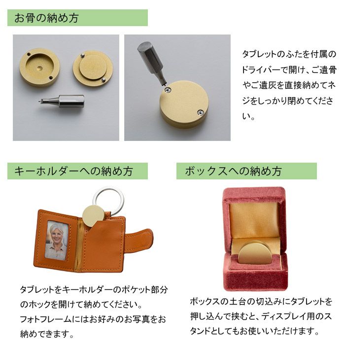 ご遺骨を納める刻印できるタブレットは、付属の専用ドライバーで簡単に、しっかりと収骨ができます。専用ドライバーは小さなネジにもぴったりはまる安心設計です。