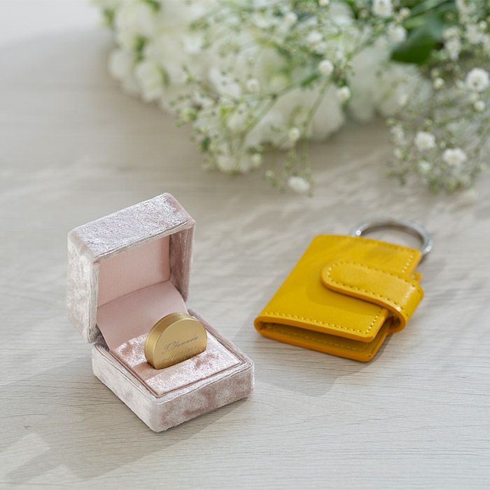 お出かけの時は携帯用ホルダーにいれてバッグチャームに、ご自宅では高級感あふれるベロア調の専用ボックスに入れて飾れます。蓋を開けたままでも倒れないボックスです。