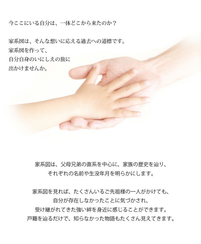 家系図を見れば、たくさんいるご先祖様の一人がかけても、自分が存在しなかったことに気づかされ、受け継がれてきた強い絆を身近に感じることができます。戸籍を辿るだけで、知らなかった物語もたくさん見えてきます。