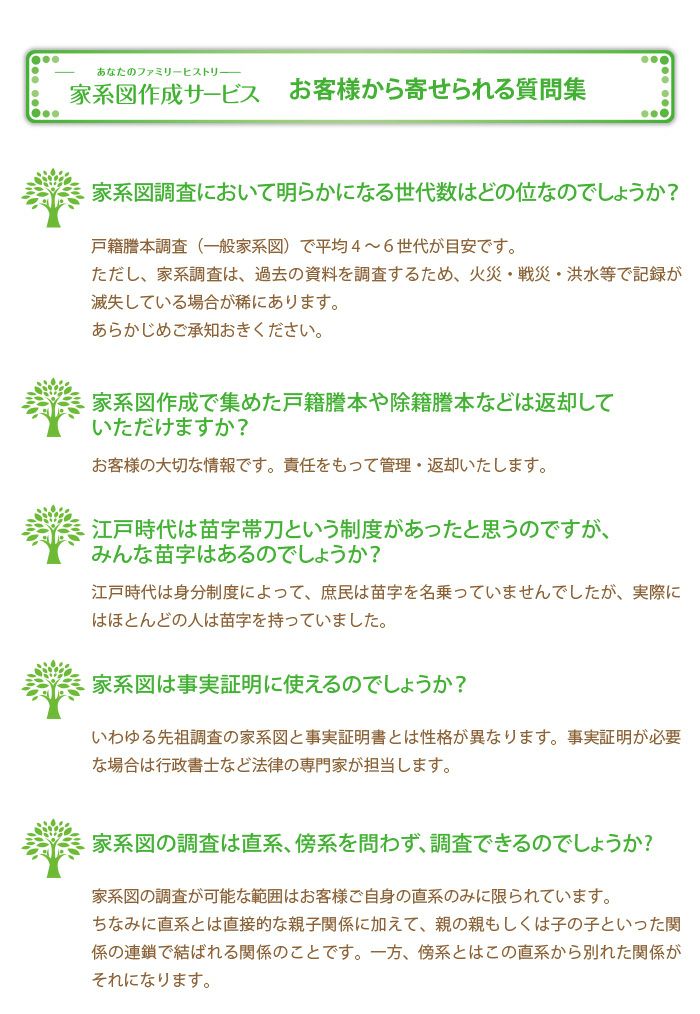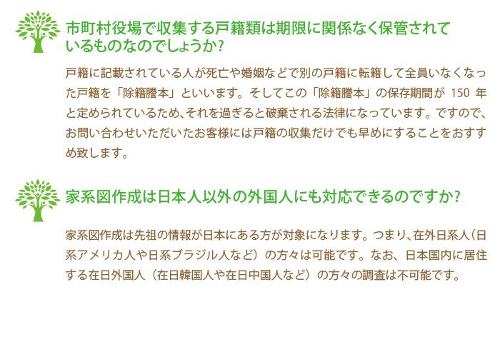 家系図作成は先祖の情報が日本にある方が対象になります。つまり、在外日系人(日系アメリカ人や日系ブラジル人など)の方々は可能です。なお、日本国内に居住する在日外国人(在日韓国人や在日中国人など)の方々の調査は不可能です。