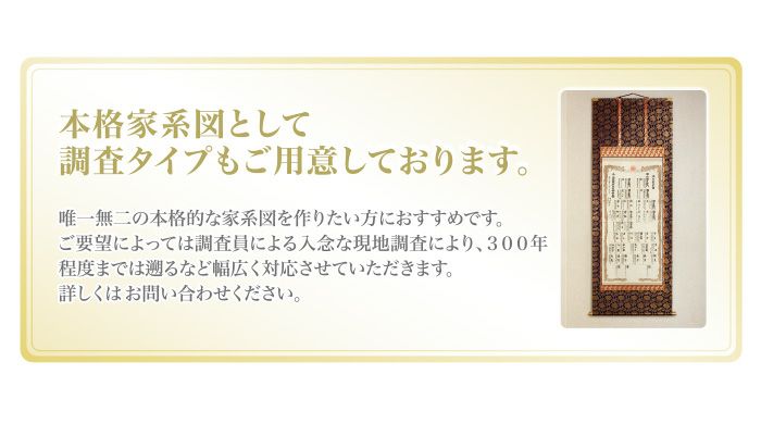 戸籍謄本調査(一般家系図)で平均4~6世代が目安です。ただし、家系調査は、過去の資料を調査するため、火災・戦災・洪水等で記録が滅失している場合が稀にあります。あらかじめご承知おきください。
