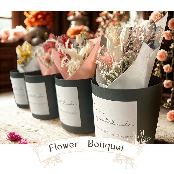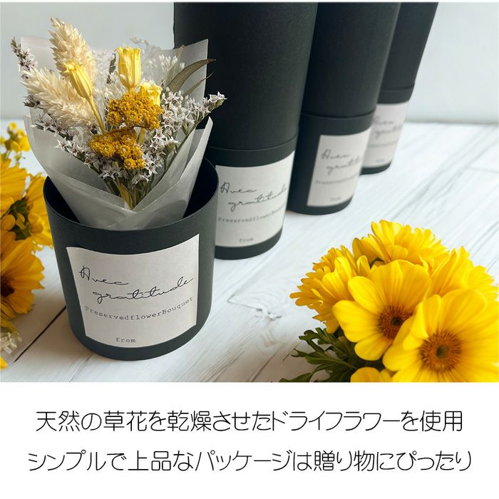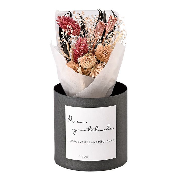 落ち着いた印象の黒いペーパーチューブに、やさしい色合いの花々を束ねたドライフラワーブーケ。