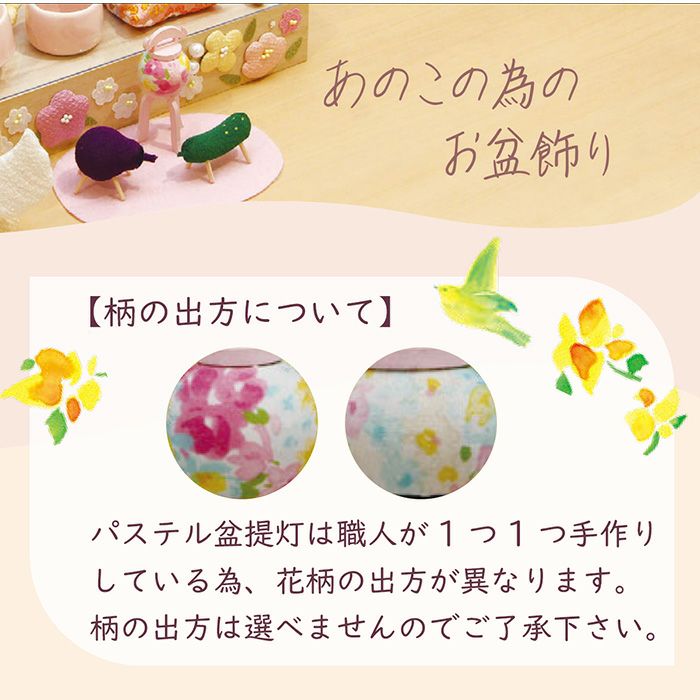 なお、パステル盆提灯は職人が1つ1つ手作りしている為、花柄の出方が写真とは若干異なります。
